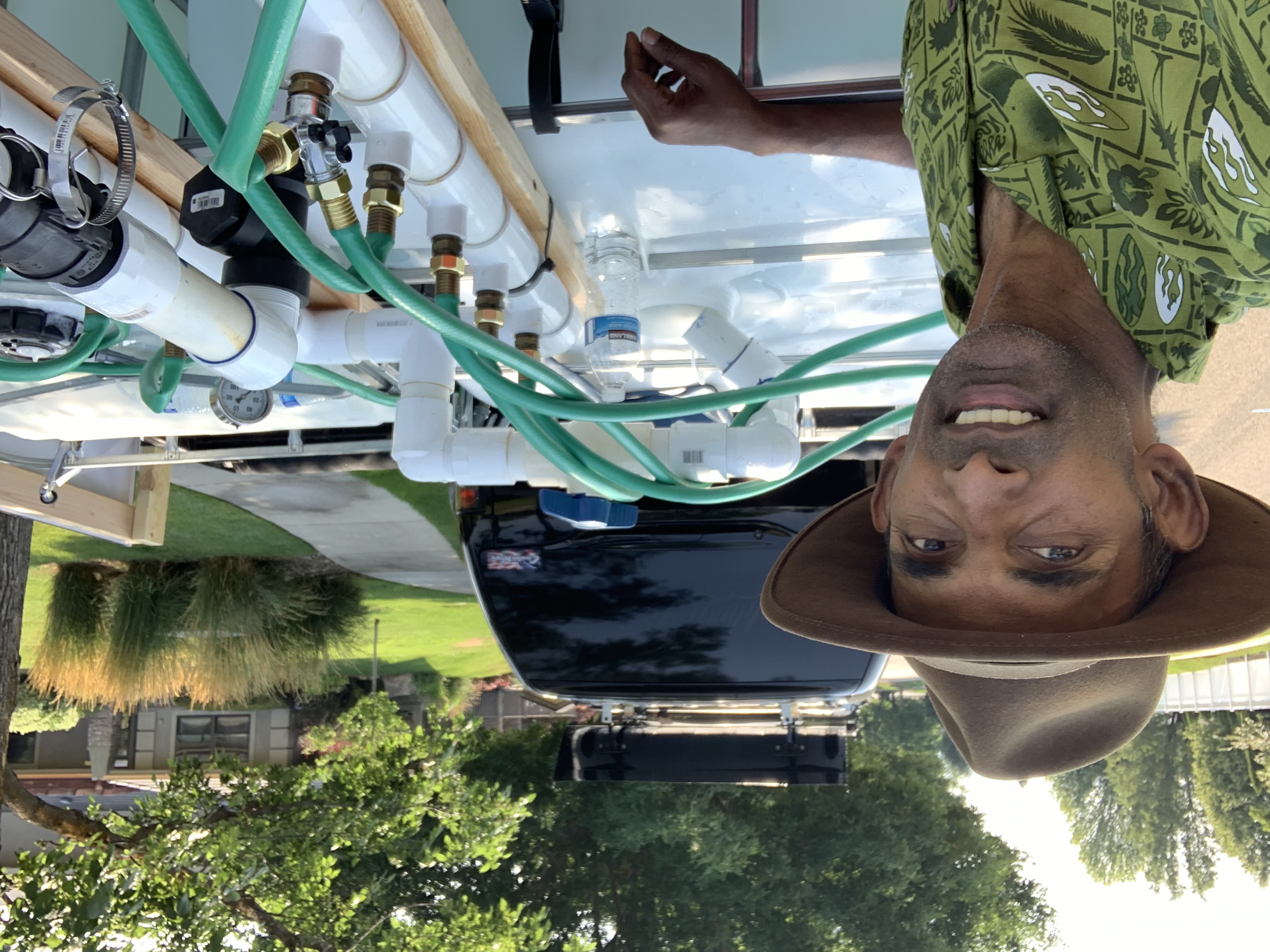 The plumbing system work like this; each tank has a drain valve at the bottom of each tank. We created a drain network with PVC piping connecting all the tanks. Gravity and suction from the pump will drain the water through the system. One opening directs the water to the gas powered pump in the back. The gas powered pump discharges the water into the overhead manifold. To keep a little cheaper to extend across the whole trailer we use black sprinkler hose. Then created connection points for the garden hoses. At the end of the manifold there is a return for any excess water. A valve at the end opened & closed the return, while also acting as a pressure control valve. We also added a pressure gauge to keep watch of the water pressure.