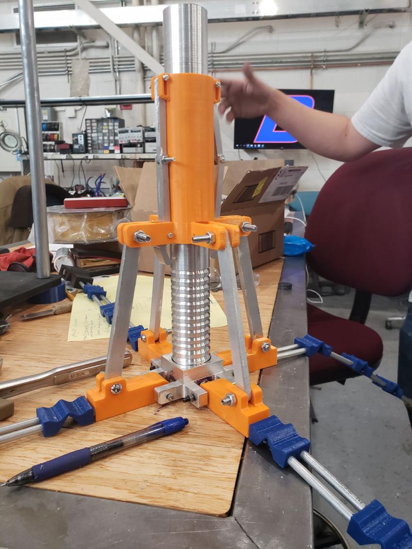 The way I saw the problem is that you needed to "grab onto something". I things that I know is good at grabbing things is the human hand. It eventually simplified into a claw machine style of hand. Then I just needed a locking mechanism. At the time I got one of those belts that have a ratchet like system. So, I incorporated a ratchet system into the design. I also had a 2in aluminum round stock I had for an other personal project. Made the center part round. Created my paper solution that you see on the left.